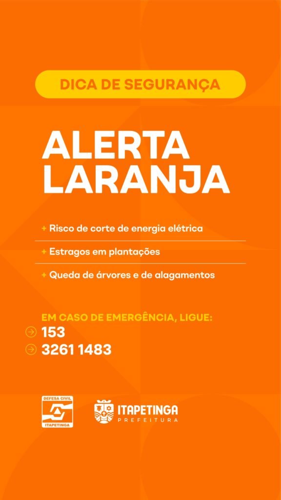 A Defesa Civil de Itapetinga emitiu um Alerta Laranja devido à previsão de chuvas intensas e ventos fortes para o