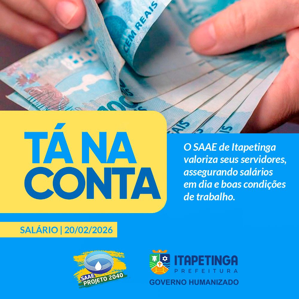 O Serviço Autônomo de Água e Esgoto (SAAE) de Itapetinga iniciou fevereiro de 2026 com o salário dos servidores devidamente creditado, reafirmando o compromisso com a responsabilidade e a valorização do funcionalismo.